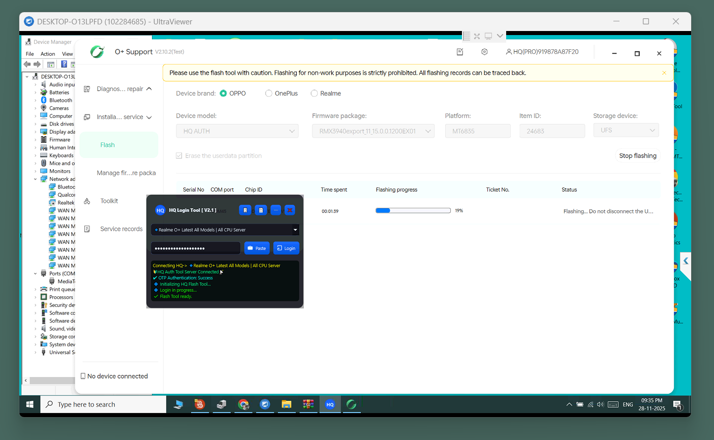 HQ LoginTool is a specialized flashing and device management tool designed for Realme, OnePlus, and Oppo smartphones. It is primarily used by service technicians and advanced users to perform firmware updates, unbrick soft-bricked devices, remove FRP locks, and execute various low-level device operations. HQ LoginTool interfaces with devices over USB and supports both Qualcomm and MediaTek chipsets, providing access to bootloader control, EDL (Emergency Download Mode) commands, and secure firmware flashing protocols.The tool often requires authentication and works in conjunction with authorized server-side mechanisms to ensure safe and secure flashing procedures. By integrating OEM-specific methods and command sequences, HQ LoginTool simplifies complex recovery and flashing processes, making it a valuable utility in mobile repair and refurbishment environments.
