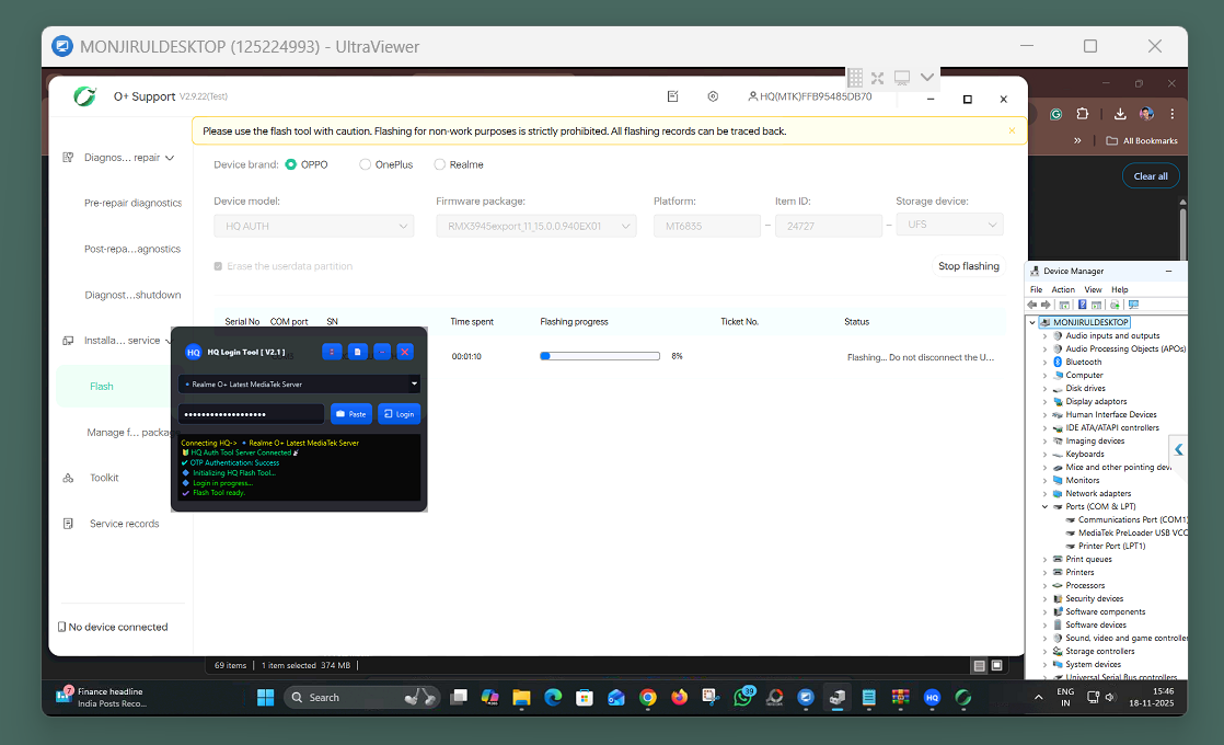 HQ LoginTool is a specialized flashing and device management tool designed for Realme, OnePlus, and Oppo smartphones. It is primarily used by service technicians and advanced users to perform firmware updates, unbrick soft-bricked devices, remove FRP locks, and execute various low-level device operations. HQ LoginTool interfaces with devices over USB and supports both Qualcomm and MediaTek chipsets, providing access to bootloader control, EDL (Emergency Download Mode) commands, and secure firmware flashing protocols.The tool often requires authentication and works in conjunction with authorized server-side mechanisms to ensure safe and secure flashing procedures. By integrating OEM-specific methods and command sequences, HQ LoginTool simplifies complex recovery and flashing processes, making it a valuable utility in mobile repair and refurbishment environments.